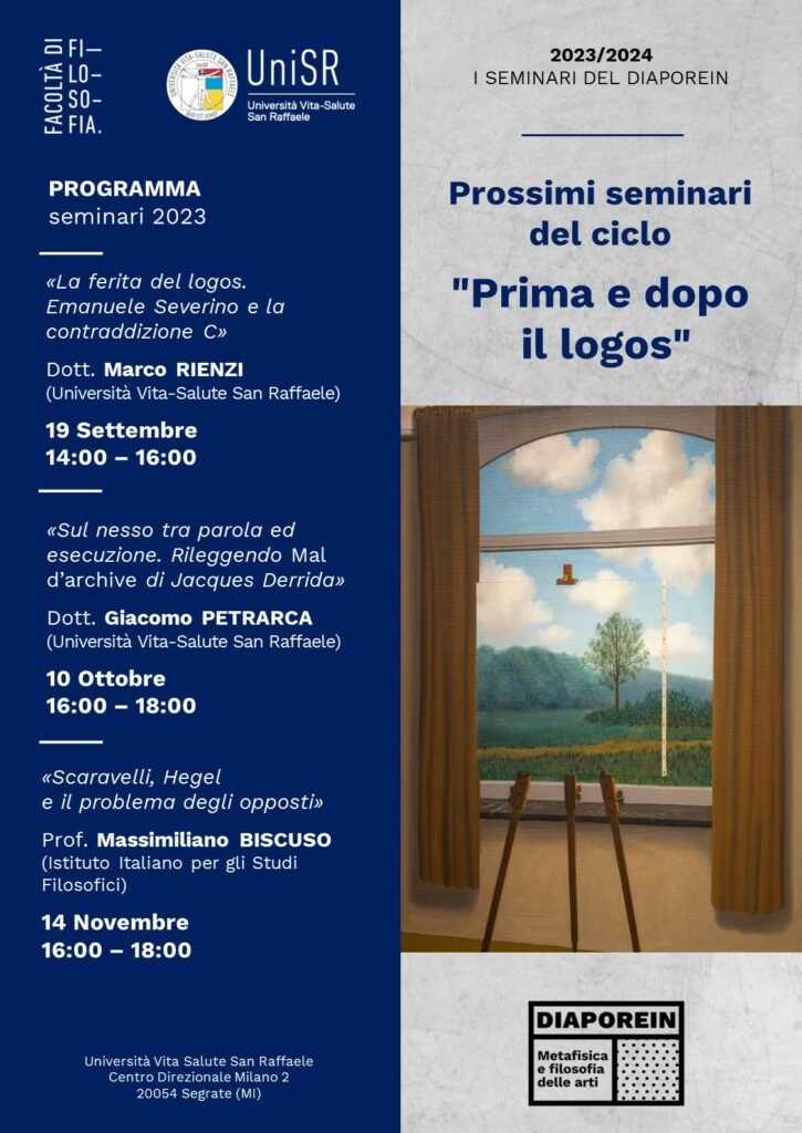 “Prima e dopo il logos” è un’iniziativa in forma seminariale organizzata dal centro di ricerca Diaporein; con cadenza mensile, da settembre 2022, rappresenta il momento di confronto e di dialogo attraverso cui, interrogando passi notevoli di autori centrali per la storia dei limiti e delle potenzialità del logos, si sviluppa il macro tema 2022-2026 del centro di ricerca.